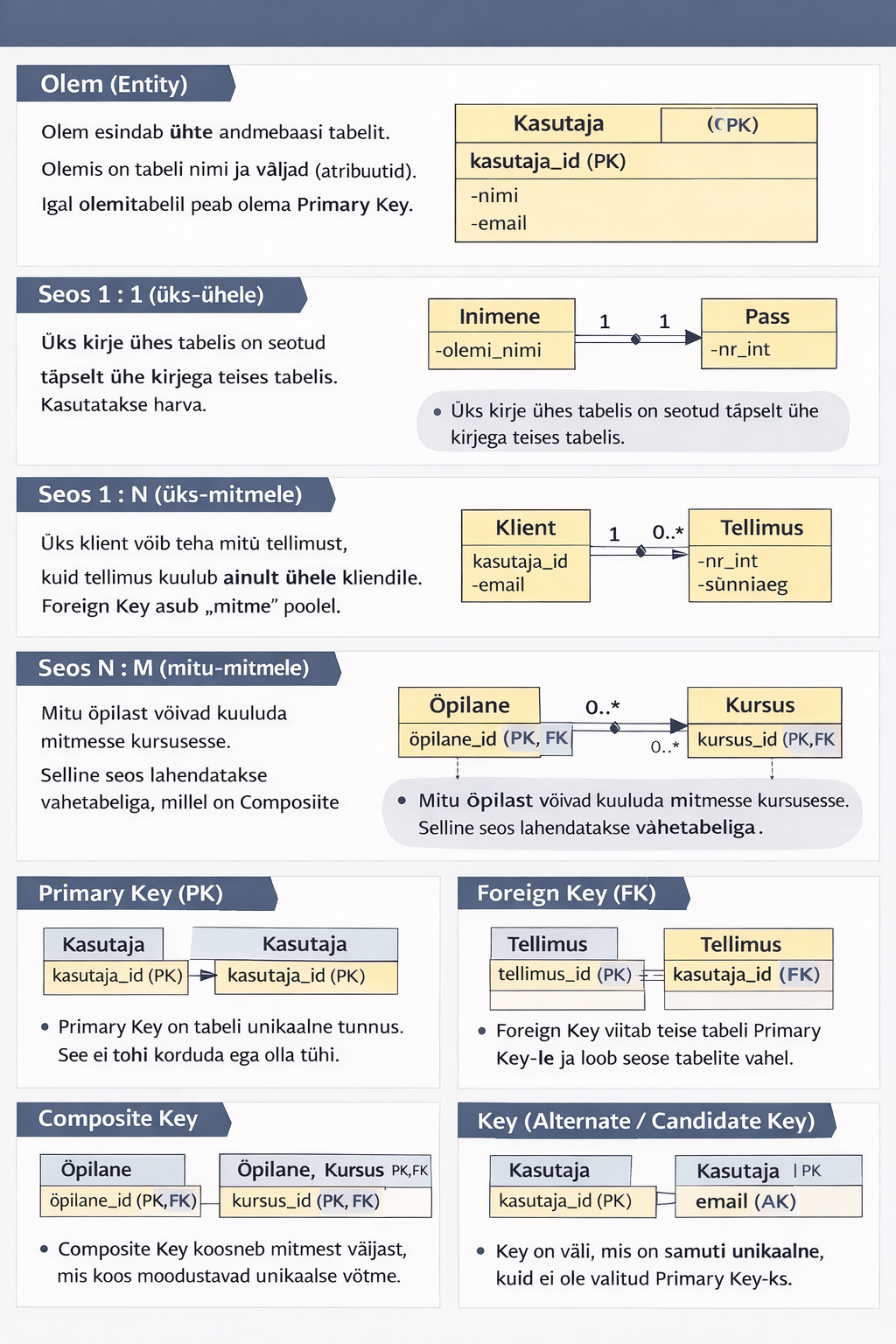 Igal olemitabelil on Primary Key. Kui üks tabel peab viitama teisele, lisatakse viitavasse tabelisse Foreign Key. Mitu-mitmele seosed tehakse vahetabeliga, kus on kaks Foreign Key-d ning tihti Composite Key nendest väljadest.